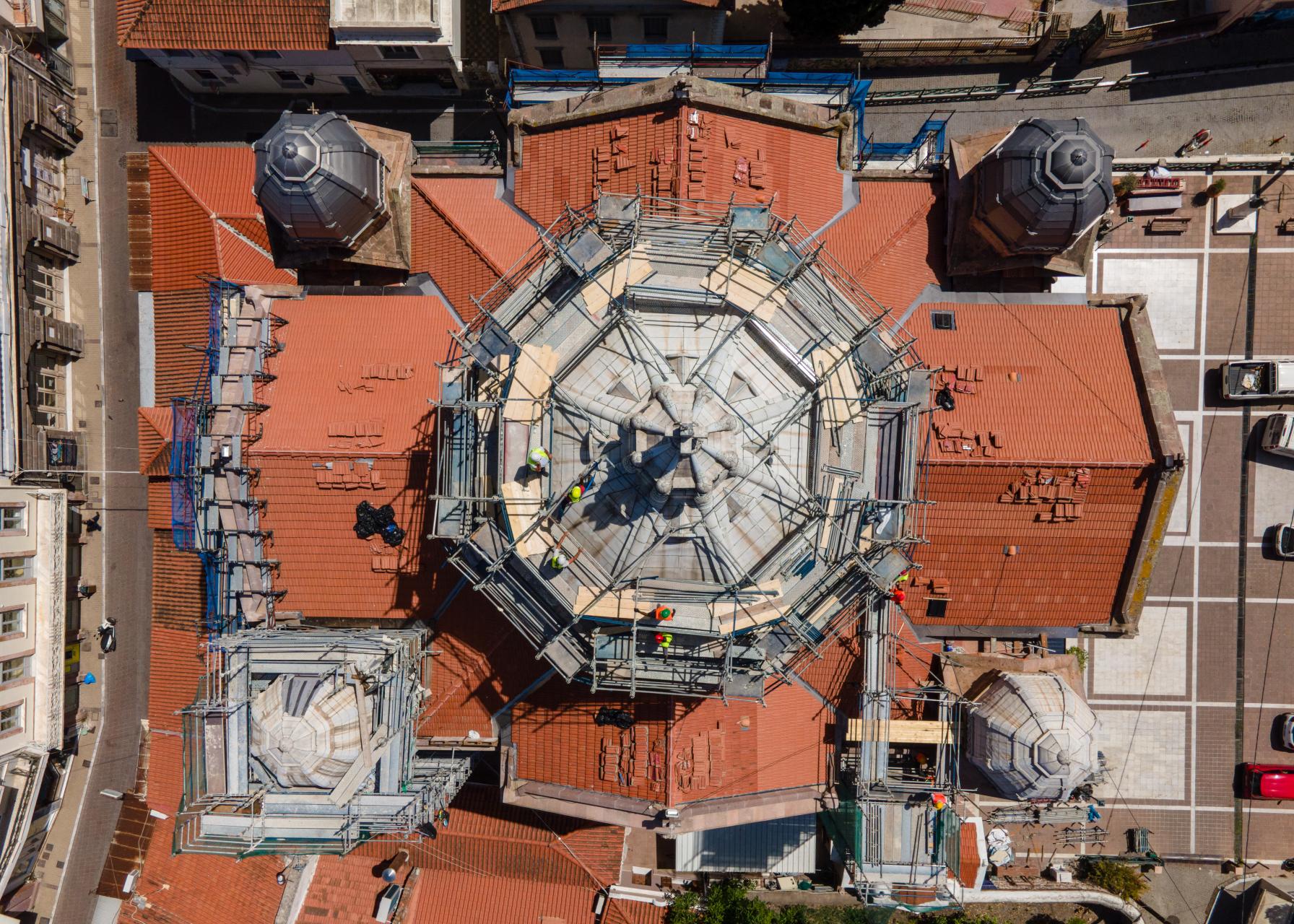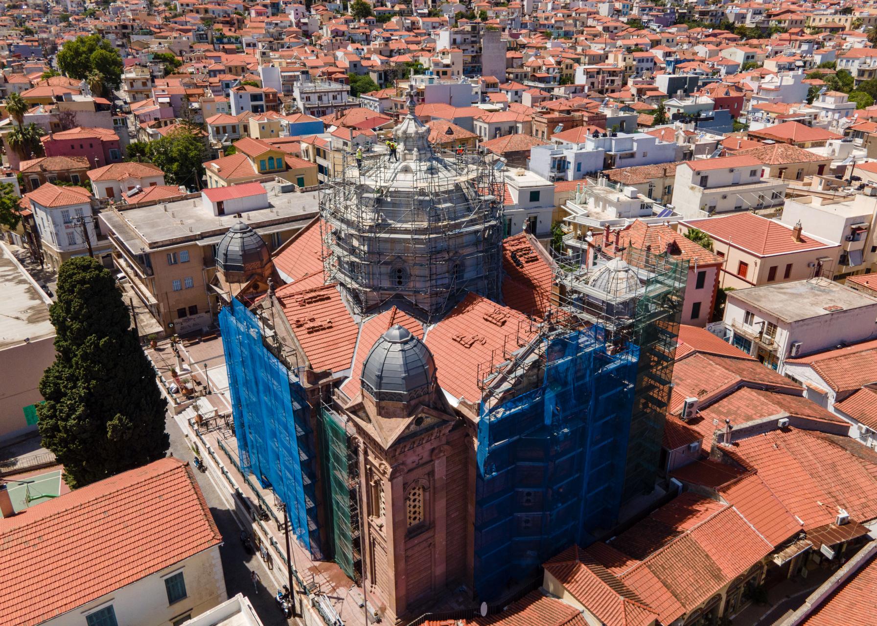 Τοποθέτηση ροζέτας περιμετρικά του τρούλου για την επισκευή του.Πλαισιακή σκαλωσιά και κρεμαστή πλαισιακή σκαλωσιά, με χρήση φουρουσιών, γεφυρών και μεταλλικών μαδεριών για την συντήρηση του ναού.